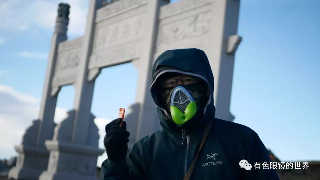 无阻力耐极寒面罩(以下简称面罩),它由三部分组成:迷彩抓绒护脸、呼吸换热网、冷凝水收集槽。目前,抓绒部分有黑,粉,红仅有一两只,因手工制作以及材料还在实验阶段,没有太多选择,个人感觉大五-10度外加5级左右大风的情况下完全感觉不出冷,后期改进是否可以考虑使用更轻薄一些的材质或者类似于X-Bionic面罩的材质有一定的弹性以适应不同环境,设计不同产品应用场景。呼吸换热网黑色和白色组合,造型上有点神似“猪”鼻,内里是多层吸热能力强并且不吸水的换热网,作用是提升透气并尽可能吸收更多热量(稍后会在原理上详细分析)。冷凝水收集槽是绿色软橡胶,外观上有点像老爷爷的下巴,当室外温度零下时(建议零下环境使用,在零上时收集器内会形成水滴),只需定时将槽内的冰捏碎并向外挤出即可。整体外观个人还比较接受,除了护脸部分的配色^-^,显然户外回头率很高。下面,再来一张起范儿的图片。