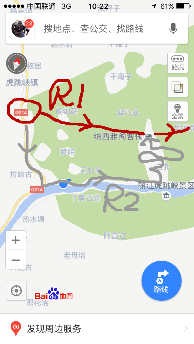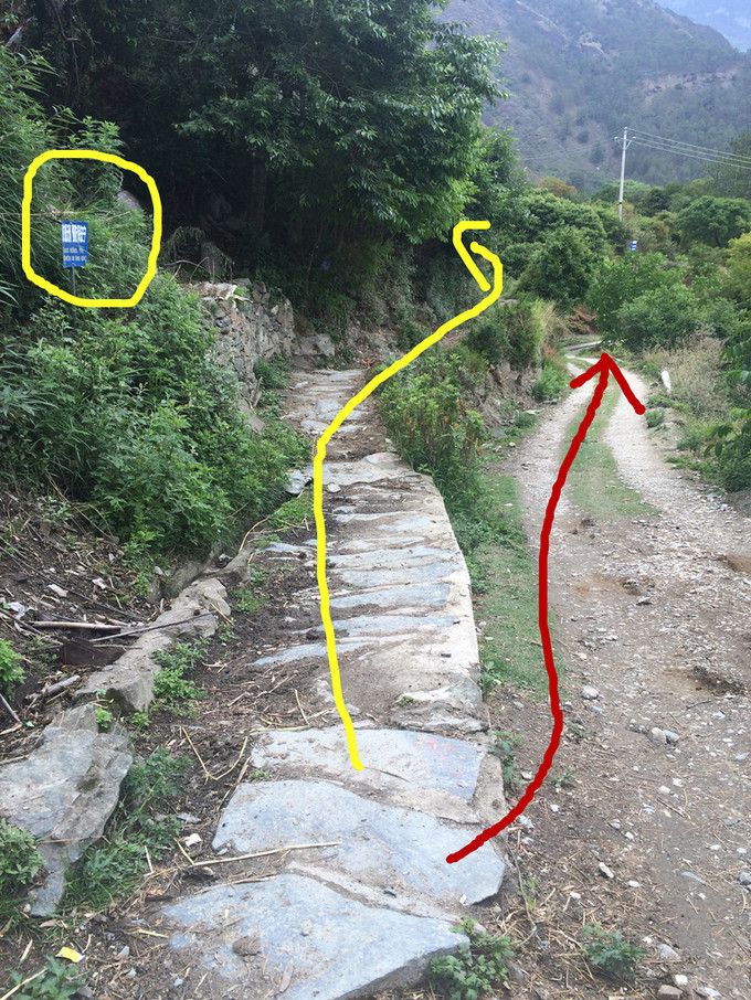 老板娘很热心,临走的时候知道我是一个很容易走错路,嘱咐了我好几次高路的路线(图中黄色箭头),事实证明她是对的。(汗) 虎跳D1,真正开始的起点是这里,接下来要挑战的是28拐,然后是一路翻山越岭,到达茶马客栈,再到Halfway。 出发时间为12点46分