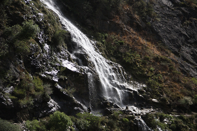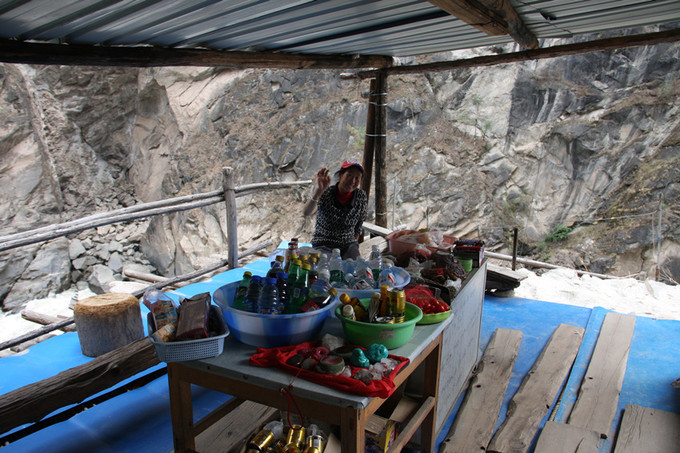 这段路最险的就是这个瀑布,一双涉溪鞋是很必要的,要不然很可能跟我一样一不小心鞋子进水。。。 之后的路基本上就是普通的山路,直到开始向下走,到Tina's买好了下午3点半返回丽江的车票150元,然后在Tina's休息了一会儿。 这里说一下,Tina's免费存包,其实就是大家都把包放在一个屋子里,有很多人其实在第一天徒步的时候已经把大部分的行李交给去往Tina’s的司机,不带行李开始从桥头出发,不像我一路负重过来的,这里请大家注意下。