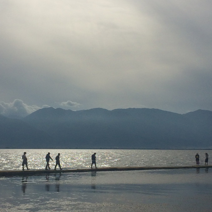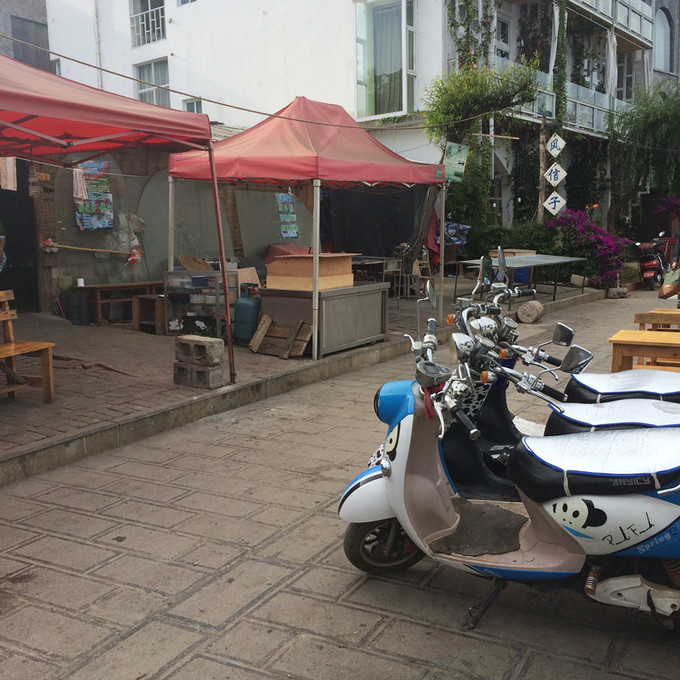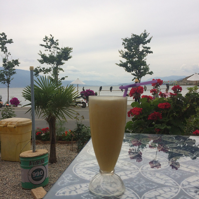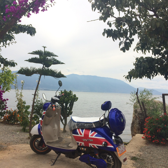 服务员小哥跟我们讲,这里的鱼在习大大来过之后只能在晚上偷偷捕鱼了,所以食材少了,更重要的是他们家杀鱼的手法还是很有讲究的,为了保证鱼肉的鲜美,杀鱼的时候是自然放血死的,似乎听上去很残忍。还有就是这里的鱼需要客人自己捞,整个院子就像江南水乡一样,鱼儿就在桌子底下游来游去,十分有格调。人均80. 吃饱之后我们各自租了一辆电动车,开始环洱海。这里有个提示就是,租车的价格在40-80之间,一般小摩托的话50左右,价格都一样,终点是要看电动车的历程,也就是是否是新车,因为这样会影响电池的使用时间。我租的那辆车就十分坑爹。